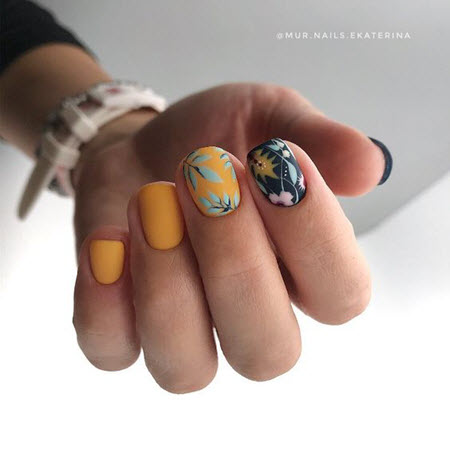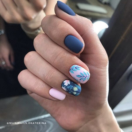 В тренде всевозможные цветочные мотивы и флористика, что может выражаться в аккуратных единичных изображениях бутонов на безымянном либо большом пальце и в настоящих цветниках, нанесённых на ногтевые пластины по типу модульных картин.