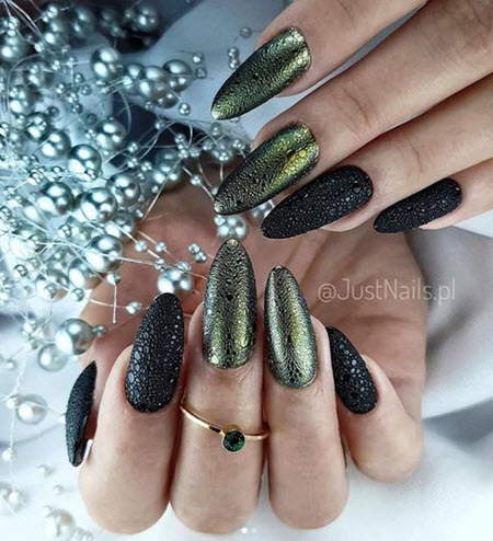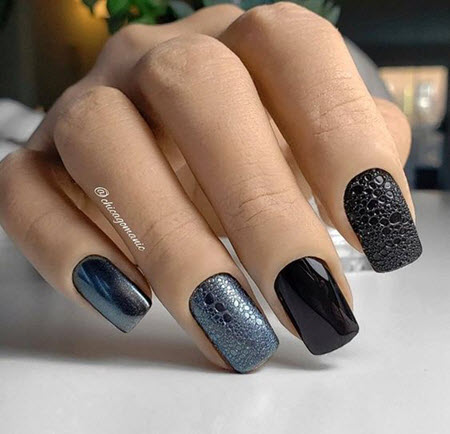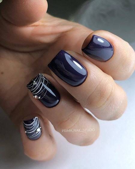 Эффект, который производит роскошный темный маникюр, всегда выгодно преображает образ. Выбор огромен из цветовой палитры, начиная с черного цвета и серого, включая винный с красным и синим, и, заканчивая, утонченным фиолетовым оттенком или зеленым тоном.