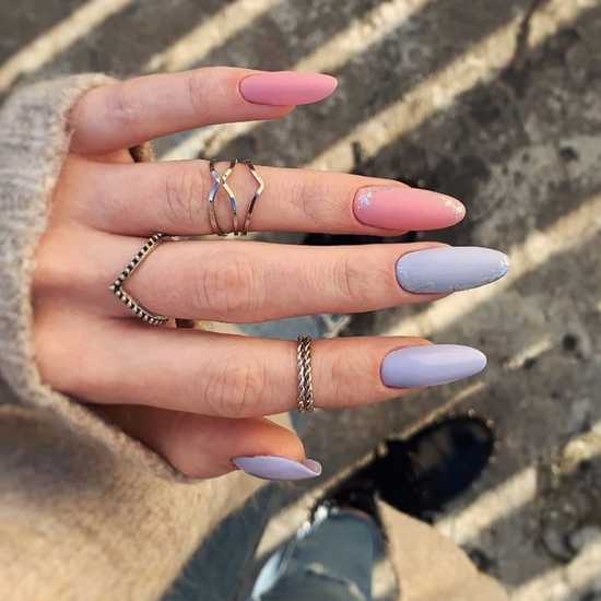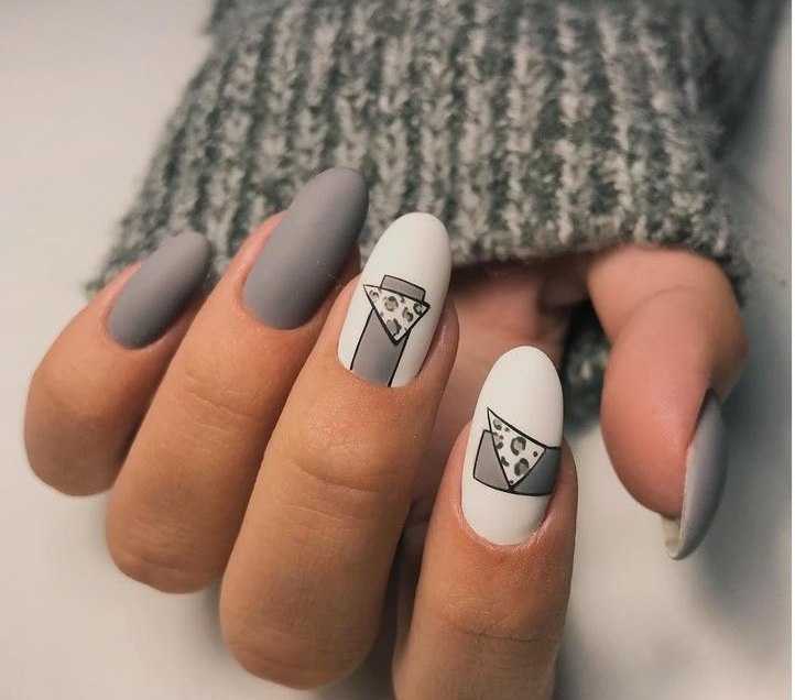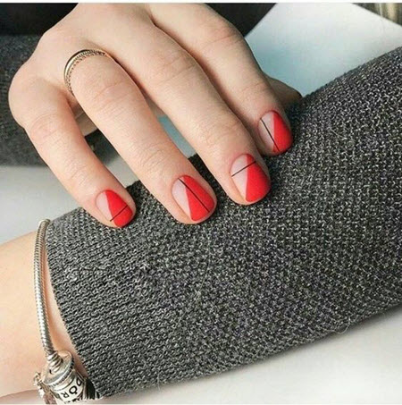 Трендовые ногти, где одна ногтевая пластина раскрашена двумя цветами, может быть максимально лаконичной, разделенной полоской, геометрической фигурой, рисунком либо декором третьего цвета.