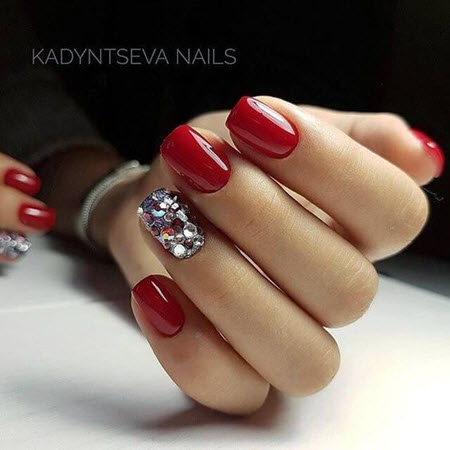 Красный цвет покрытия ногтей подходит ярким личностям, станет отличной основой и добавочным цветом в сочетании с золотой слюдой, бусинами, в технике color blocking.