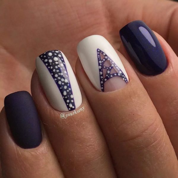 - Геометрический дизайн: Прямые линии, круги, треугольники — геометрия в маникюре в моде как никогда.