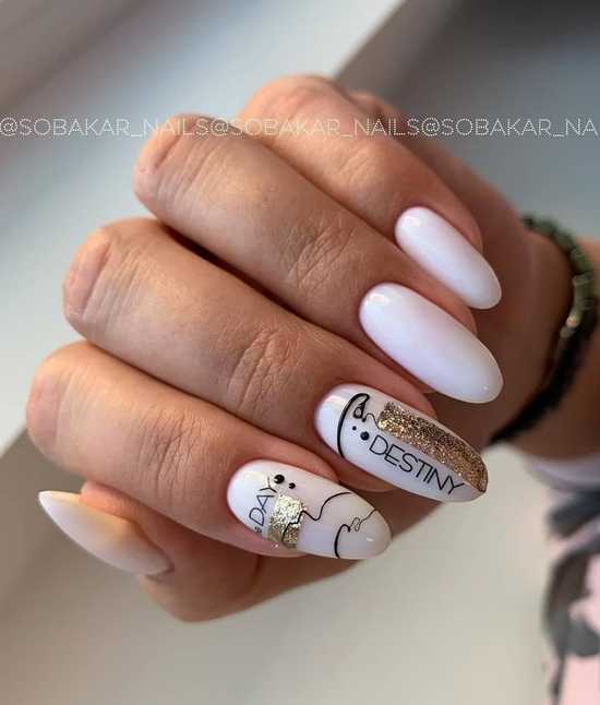 Стильный маникюр с надписями получается как на закругленном квадрате коротких ногтей, так и на длинных ноготках формы миндаль.