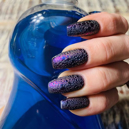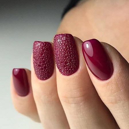 Осенний маникюр 2020 года можно дополнить пенным дизайном ногтей в топовых цветах сезона: бордовый, синий, черный, фиолетовый.
