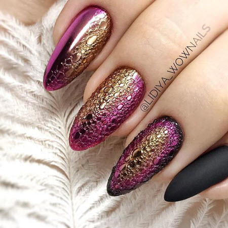 В 2023 году вызывают большой интерес и входит в массовость актуальность «металлизированных» покрытий. Многие нейл-дизайнеры советуют применять эти лаки в создании осенне-зимнего нейл-дизайна и сочетать с матовыми покрытиями темных оттенков. Модные еще обернутые специальной фольгой ногтевые пластины золотистого или серебристого цвета, чудесно сочетаются с нарочито-простыми вечерними нарядами.