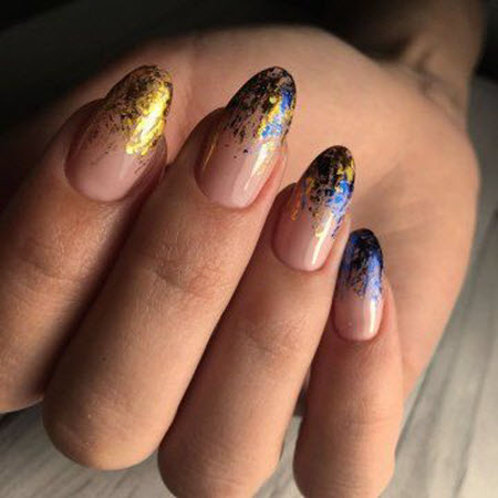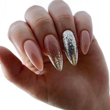 - блестки размещаются с края ногтя (цветные, серебро, золото);