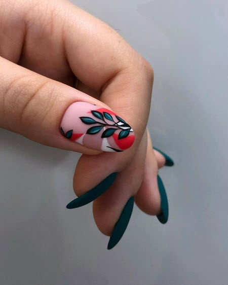 Как можно видеть на фото, популярны ногти с объемным рисунком, что заполняют больше, чем один ноготок, при этом смысл рисунка распространяется во всей маникюрной композиции.
