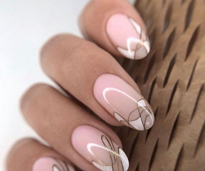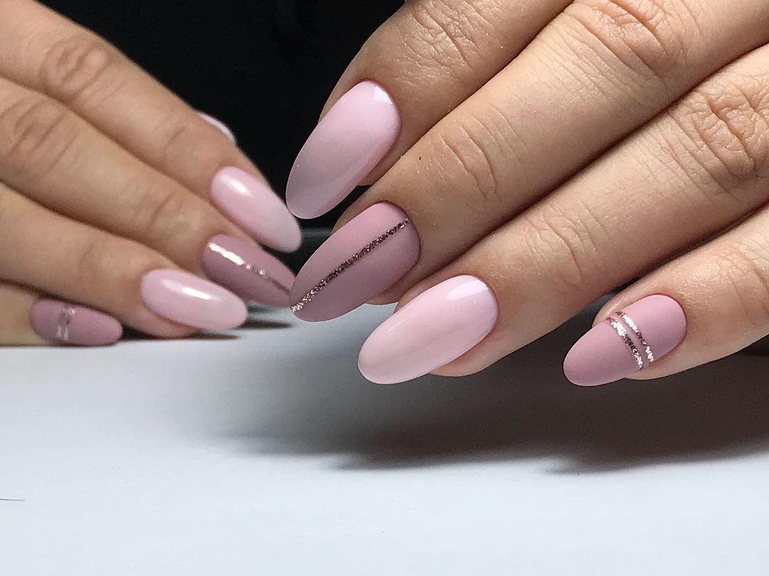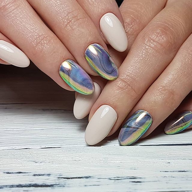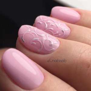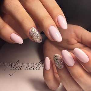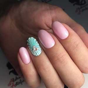 На коротких овалах смело используют все оттенки пастели, если ноготки не широкие – белые и молочные, в том числе, с изящным стемпингом на акцентах, светлой втиркой, растяжкой и металлизированными полосками.