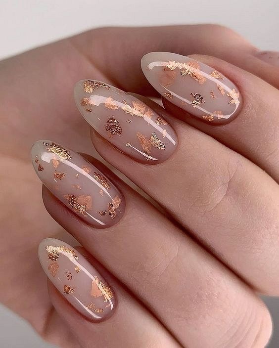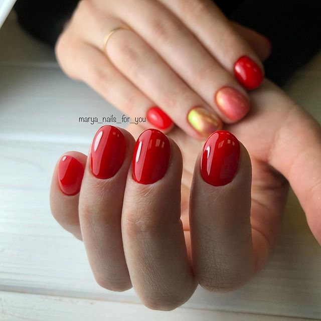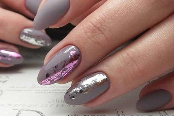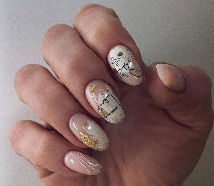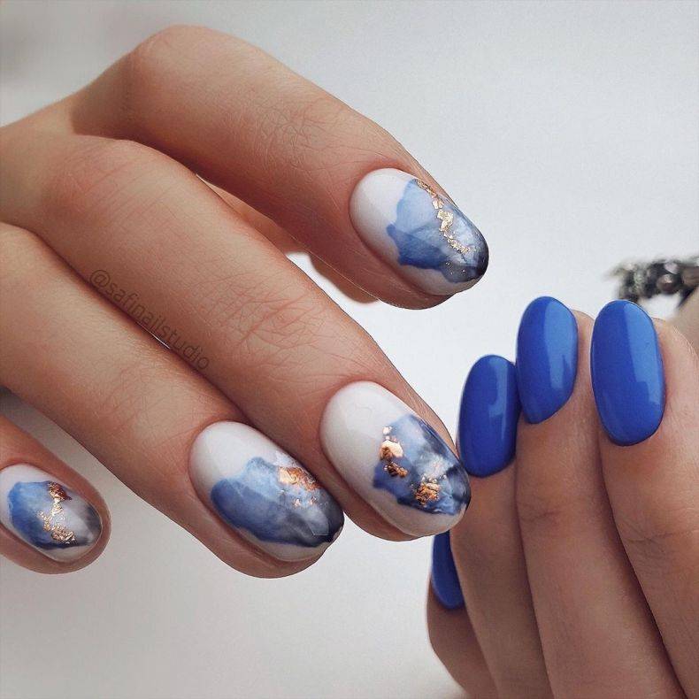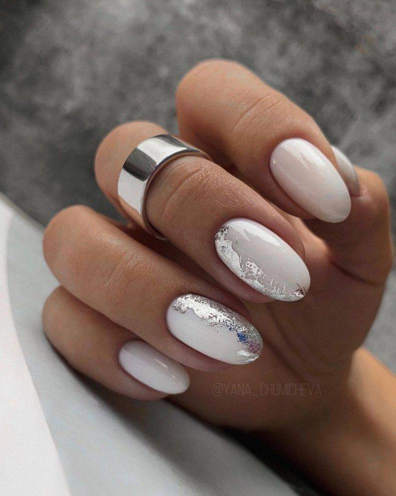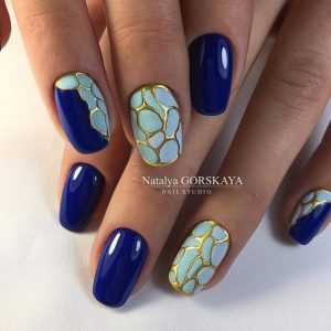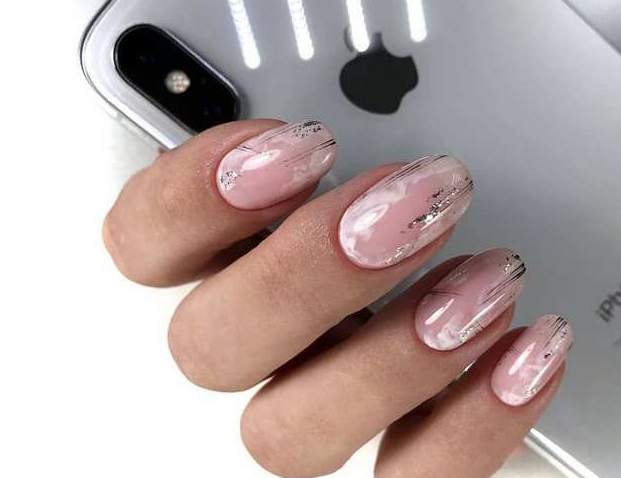 Довольно эффектно и необычно на коротких овальных ногтях будет смотреться такой популярный вариант дизайна как кракелюр из фольги или мраморный маникюр.