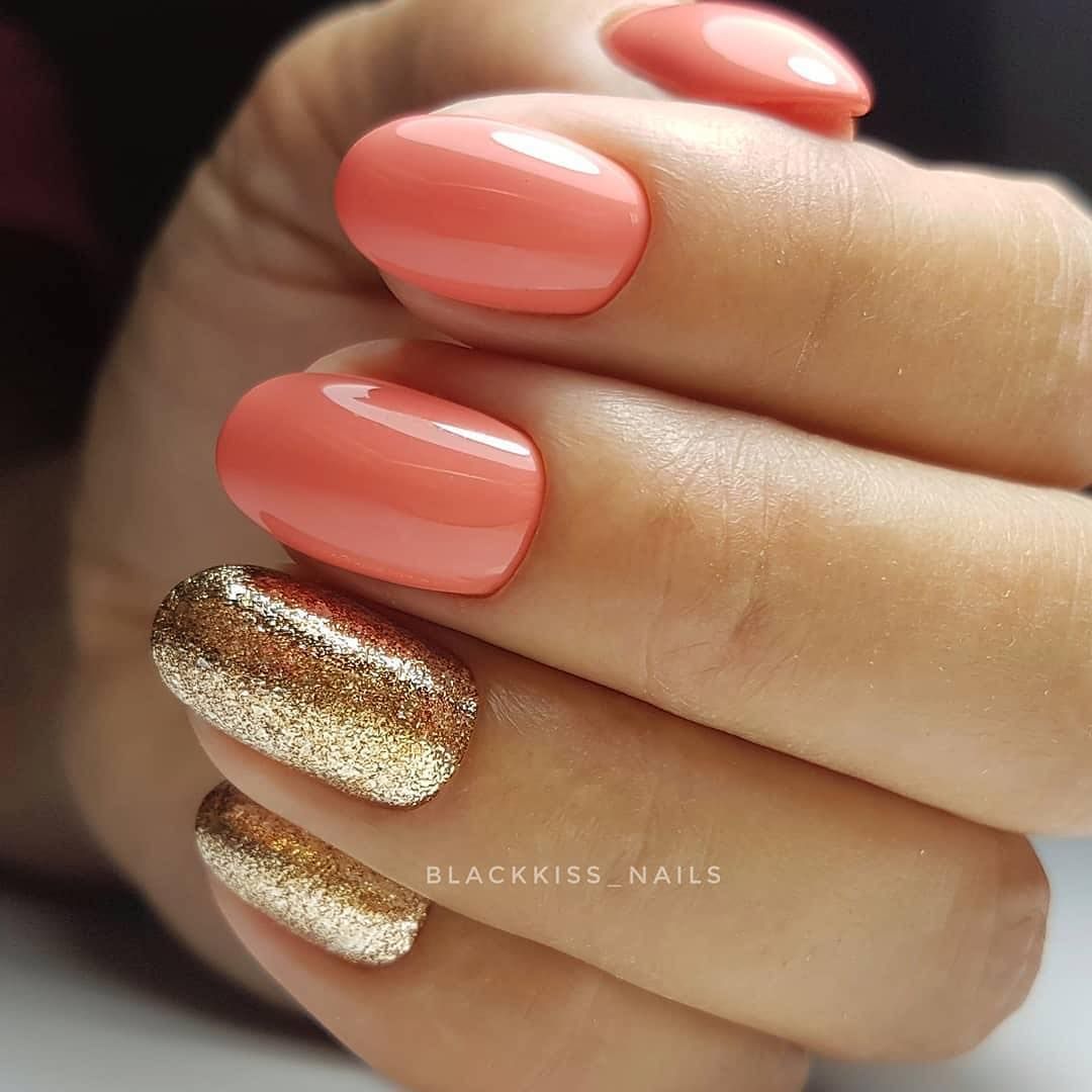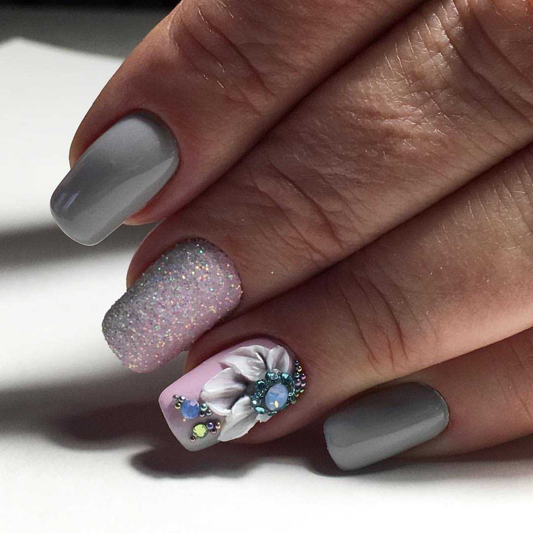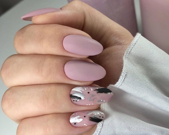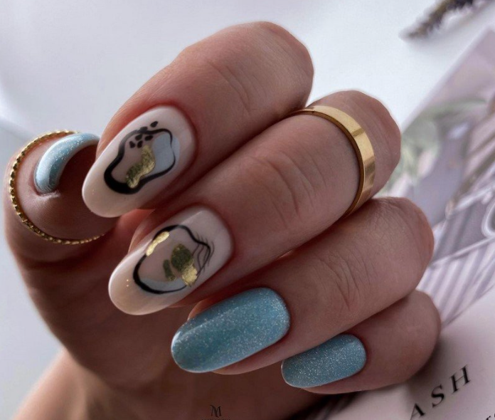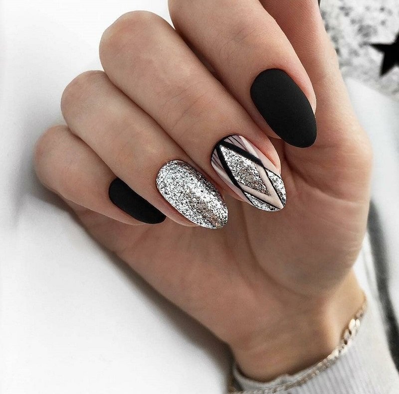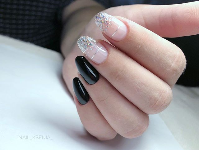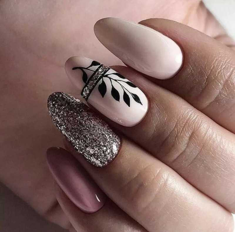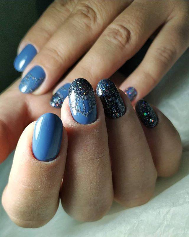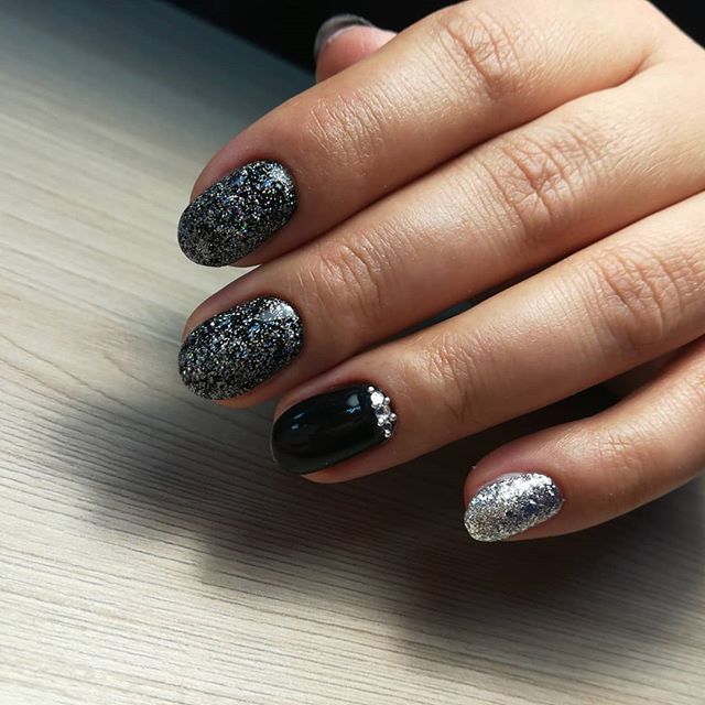 Блестки и глиттер – довольно популярное решение. Главное – не переборщить. Если выбрали глиттер, то блестки лучше не брать. А можно остановиться на варианте легкой россыпи блеска и акценте в виде контрастного рисунка на одном из ноготков.