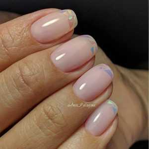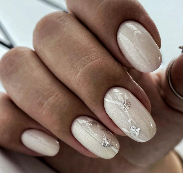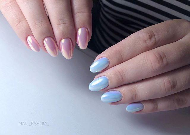 Глянцевую поверхность можно дополнить акриловой пудрой или песком, мелкими блестками или микробисером. Востребованным останется использование жемчужной или перламутровой втирки, которая сделает маникюр на овальные ногти по-настоящему сказочным и волшебным.