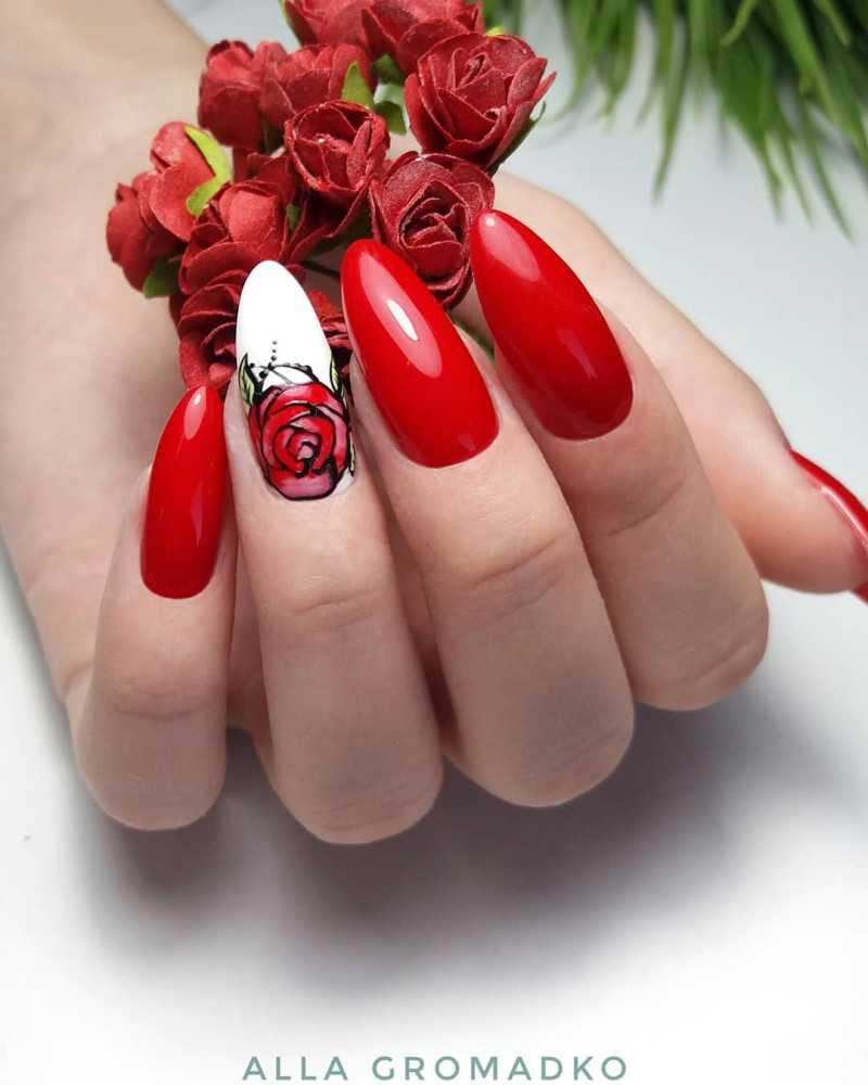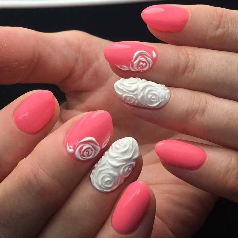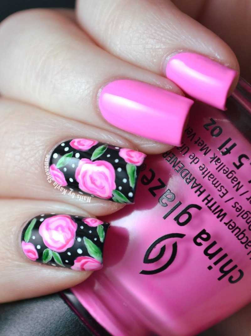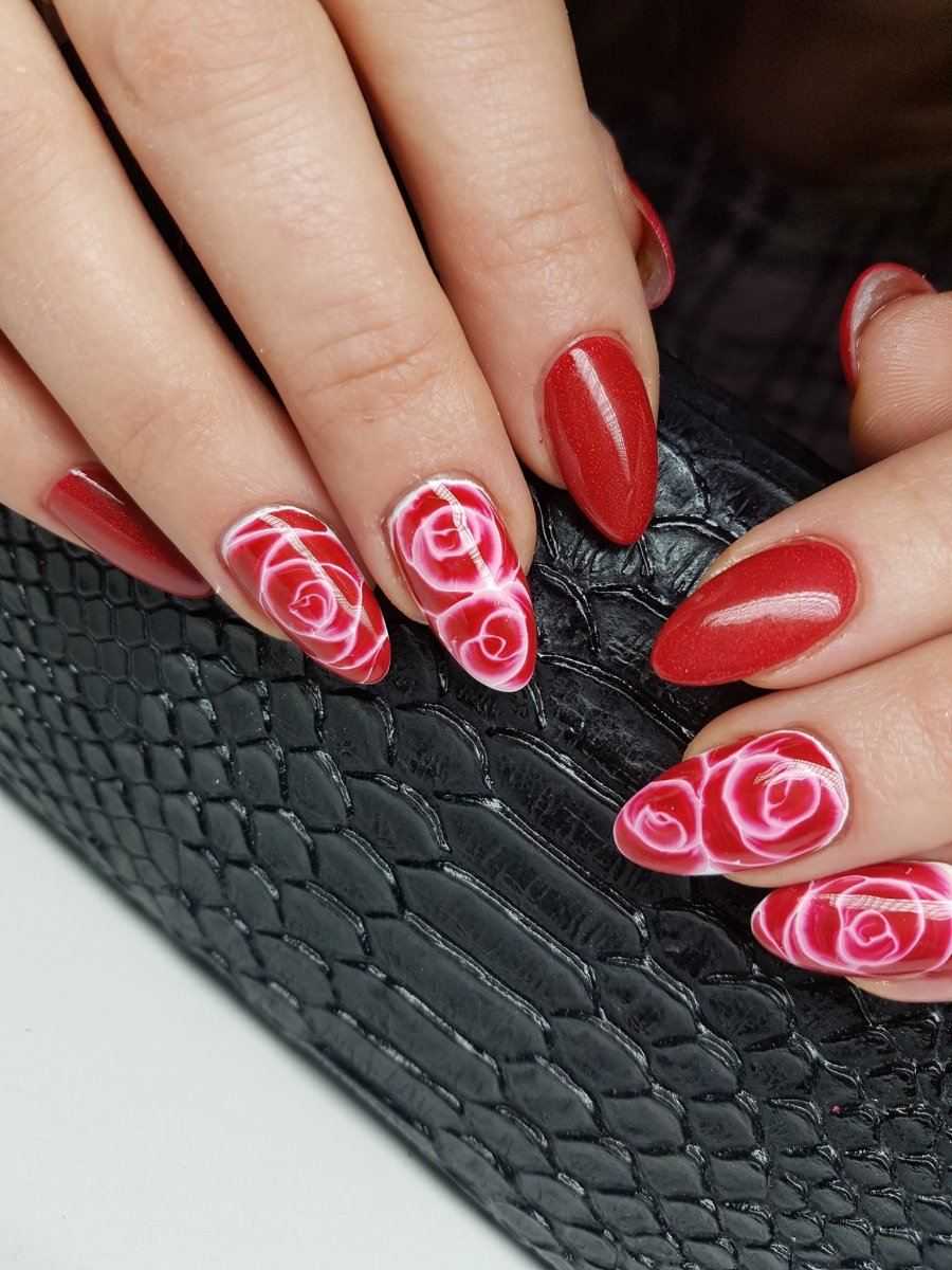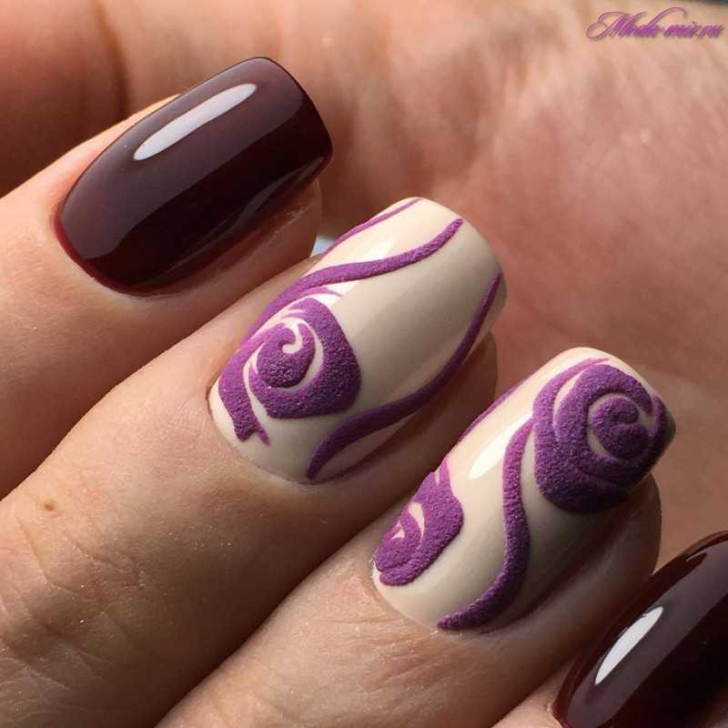 Розы – изысканные и эффектные. Они великолепно смотрятся как с пастельной цветовой палитрой, так и с темными тонами: черным, бордовым, темно-синим. Выполнить розу можно ручной росписью, стемпингом или слайдерами. Узор, выполненный маникюрными кистями, несомненно, выглядит гораздо эффектнее, тем узоры стемпингом. К тому же для профессионального нейл-мастера не составляет труда нарисовать на ноготках аккуратные лепестки розы.