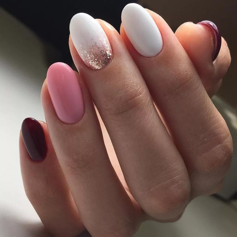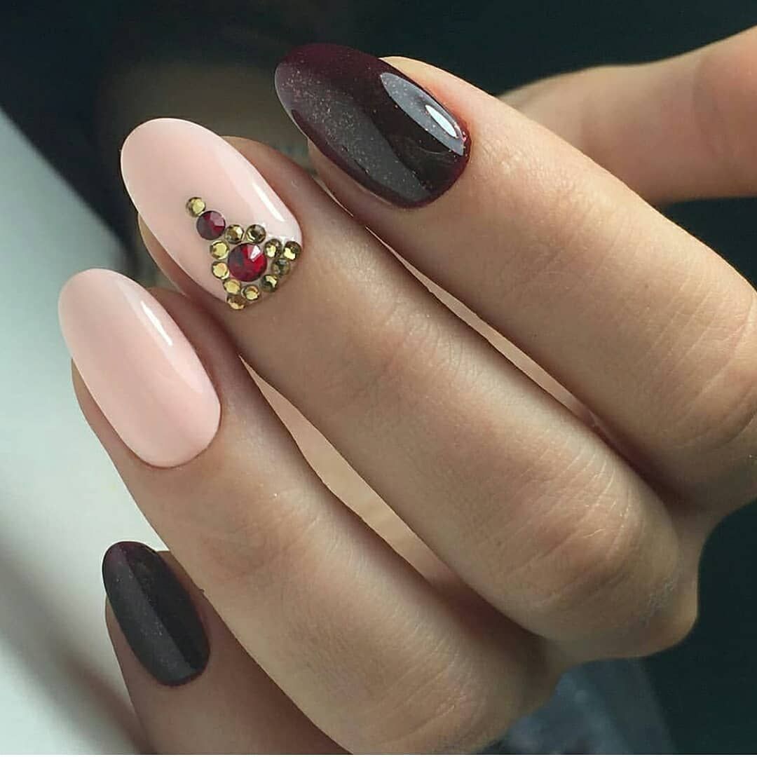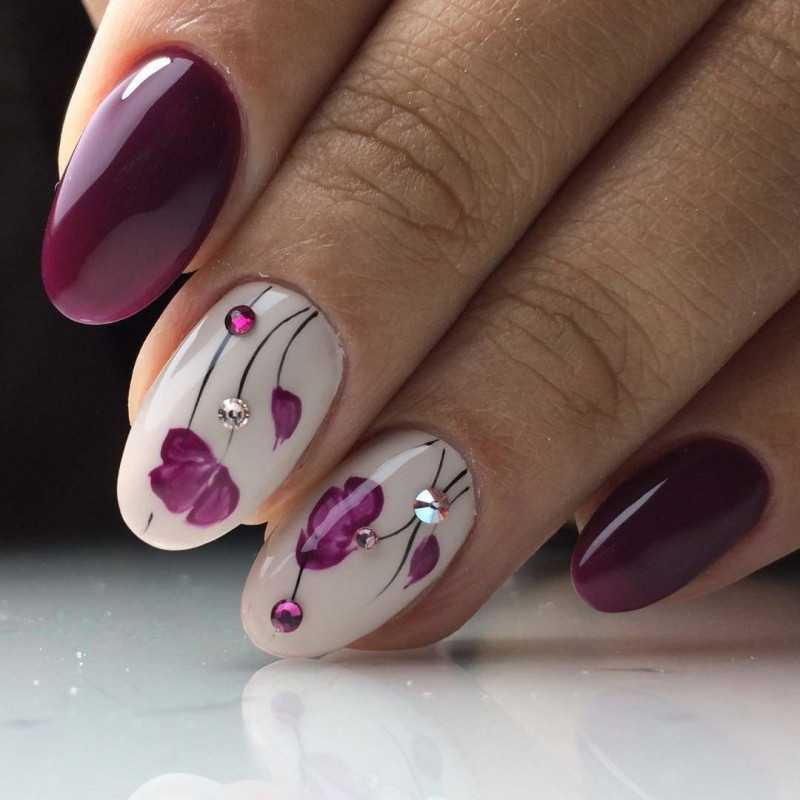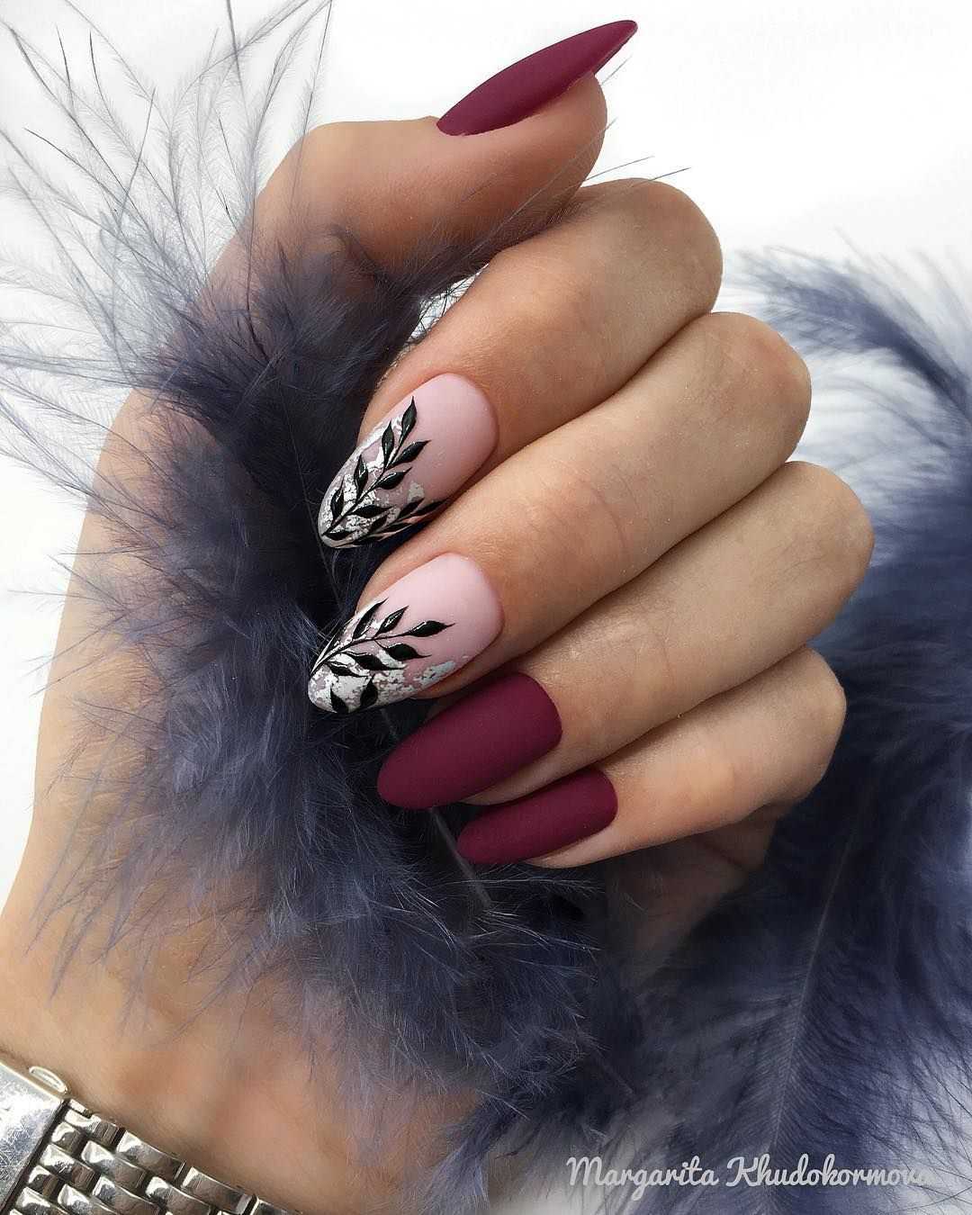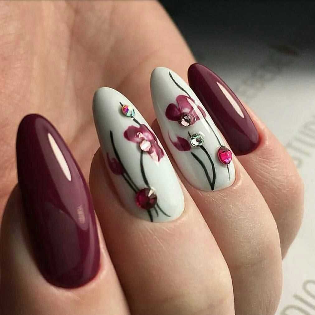 Модный маникюр бордо на овальных ногтях — это изысканный френч и оформление с золотистой фольгой, маникюр с камнями и блёстками, а также всевозможные вариации основного цвета с розовым, белым, бежевым любо другими цветами. На таком фоне уместна абстракция и анималистика, геометрия и цветочные мотивы. Берите на заметку!
