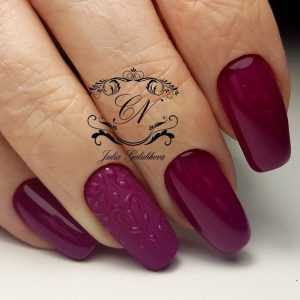 Бордовый маникюр уже давно получил статус самого роскошного и ультрамодного, поскольку его всевозможные оттенки, к примеру, винный, бургунди, сангрия, сливовый, гранатовый, спелая вишня либо рубиновый очень красиво смотрятся на ногтевых пластинах любой длины и формы. Бордовые ноготки лишены свойственной для красного цвета неудержимой энергии и яркости, но наделены королевским шармом и благородством.