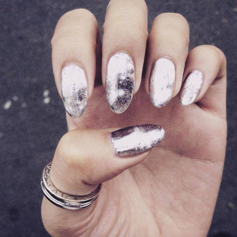 Фольгу можно использовать кусочками, сжатой, матовой или блестящей. Чаще всего с фольгой используют насыщенный темный топ. Такой необычный декор может гармонично вписаться в ваш образ.