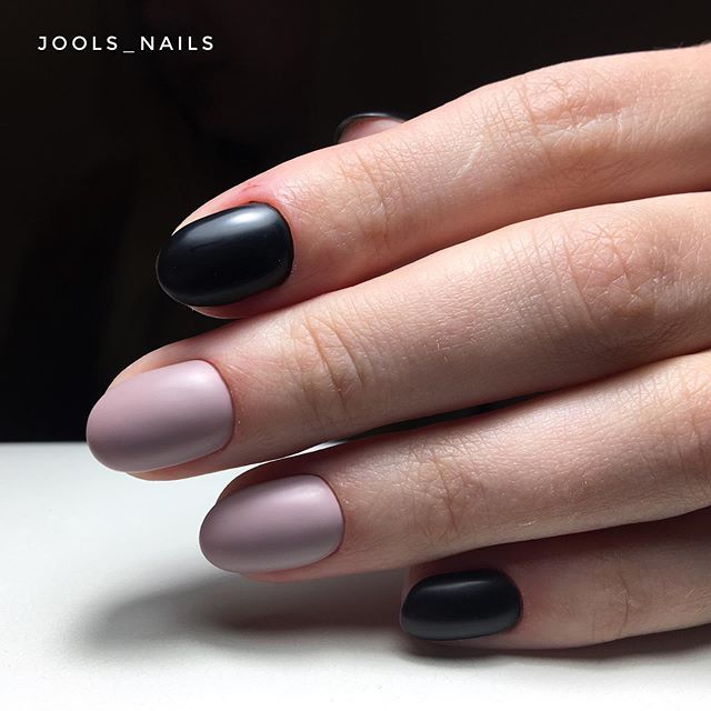 Примечательно, что используя темные тона, лучше всего добавить несколько разнообразных фактур в маникюр, например сочетание матового топа и втирки с эффектом металлик, либо использовать мерцающие лаки для хитового дизайна «кошачий глаз».