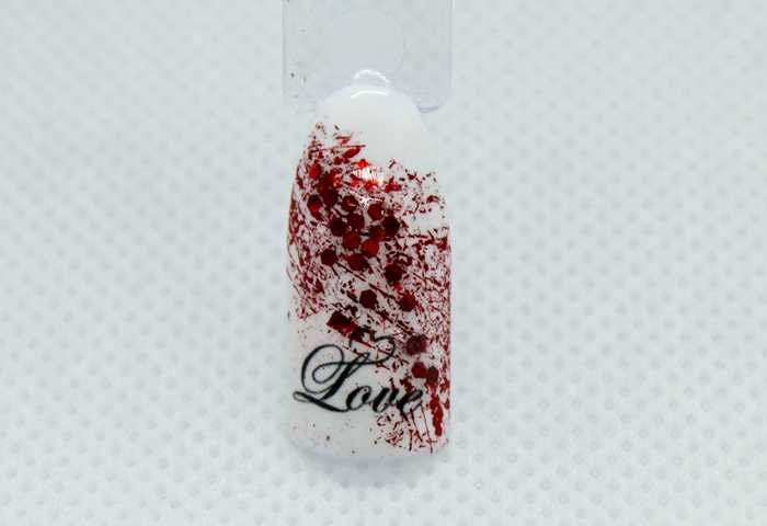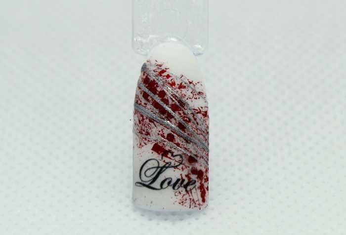 Шаг 4 – Добавим в дизайн короткую надпись. Для этого нужно взять подходящую наклейку, смочить ее водой, сдвинуть с подложки пинцетом и прилепить на ноготь.