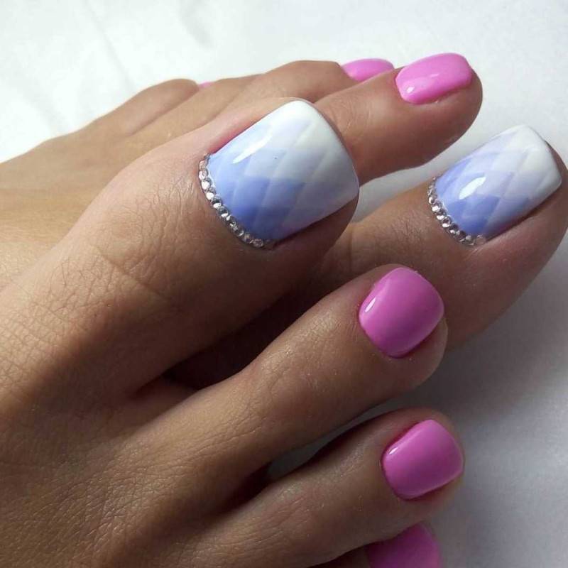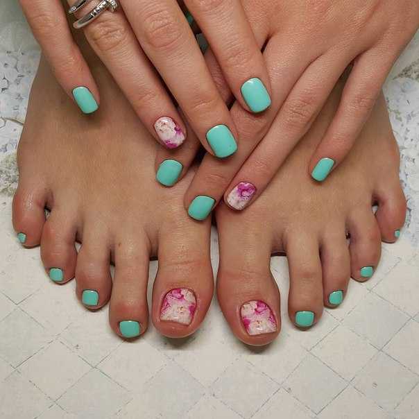 - акцент в каждом дизайне – помимо основного оттенка в дизайне должен присутствовать единый стиль, который прослеживается и в маникюре, и в педикюре. Продублируйте идею маникюра в дизайне ногтей на ногах. При этом не стоит обозначать узор на каждом пальце, достаточно изобразить небольшой изысканный рисунок на большом пальце ноги.
