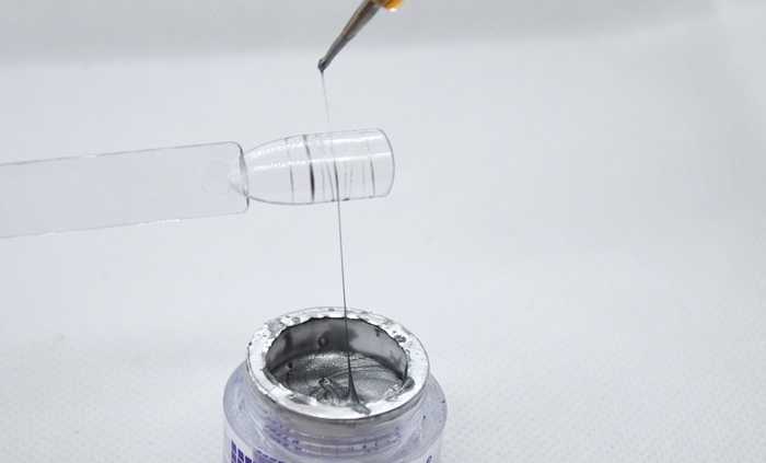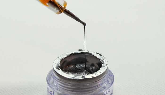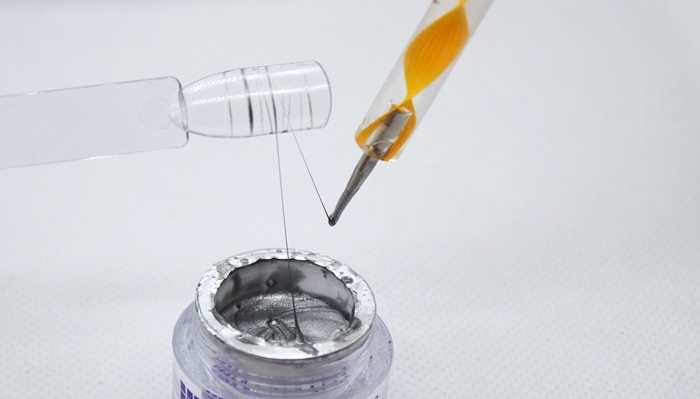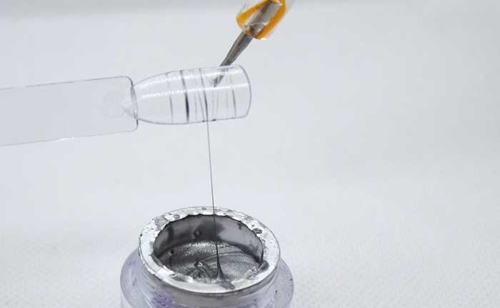 Для смешивания необходимо взять апельсиновую палочку или лопатку, а также пластиковую палитру. Капнув по несколько капель гель-краски и акриловой краски, смешайте их до однородного состояния, затем проверьте, насколько тягучим получился состав. При необходимости добавьте еще несколько капель гель-краски. У вас получится гель «паутинка».