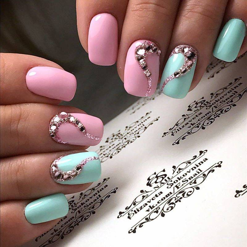 - для светлых платьев: мятного, белого, голубого, розового цвета выбирайте маникюр в пастельных оттенках, в матовой текстуре, с серебряным декором