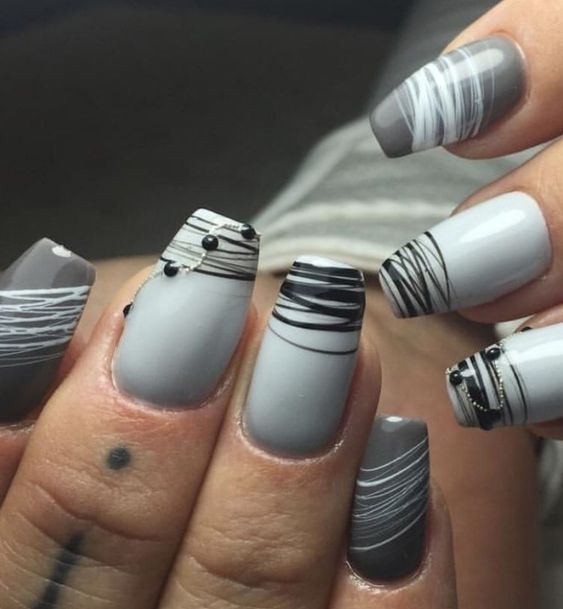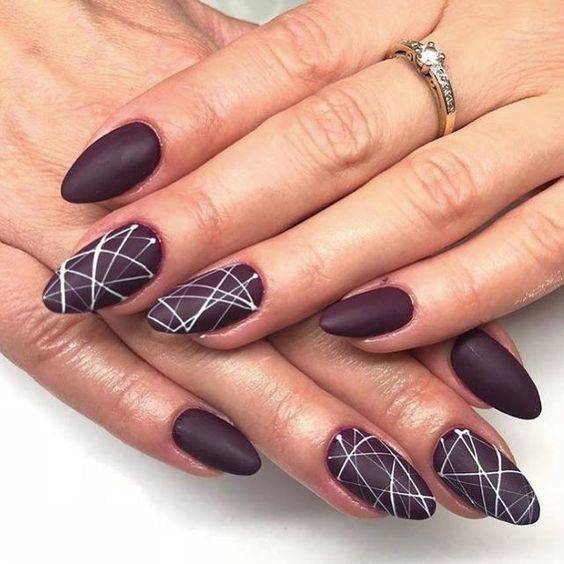 Ну и конечно же, стильная и лаконичная геометрия. Комбинируя линии разной толщины и несколько контрастных цветов на ногте, можно создать интересный дизайн в технике «паутинка». На фото ниже можно рассмотреть самые интересные на наш взгляд дизайны для коротких и длинных ногтей.