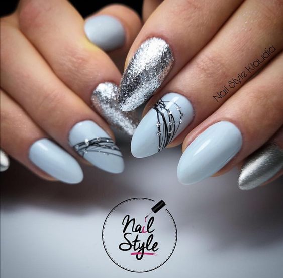 Синий цвет считается зимним. С его помощью обычно создают новогодний дизайн, выдержанный в синих тонах, припорошенных белой пудрой из акрила. Предпочтительней брать густой тёмный цвет. Из элементов хорошо смотрятся стразы, крошечные конфетти, фольга и бульонки.