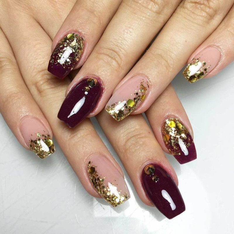 Идеальный дуэт получается из золотого фольгированного материала и лака бордового цвета. Подобное сочетание придает ногтям роскошный и изысканный вид.