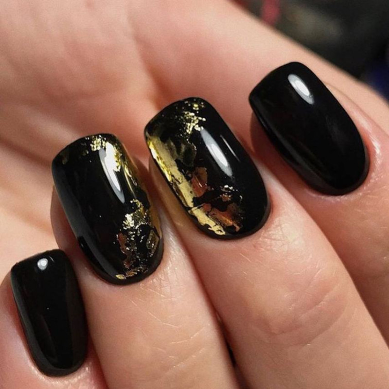 Гармонично смотрится черный лак в сочетании с золотистой фольгрованной бумагой. Подобная комбинация никого не оставляет равнодушным. Ее выбирают женщины, мечтающие об идеальном маникюре.
