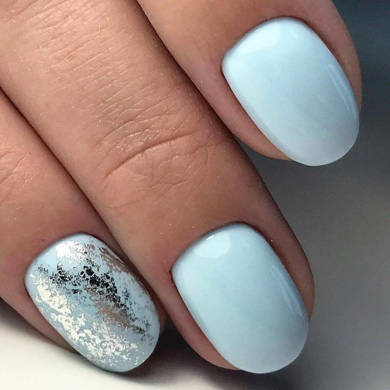 Если душа тяготеет к чему-то необычному, можно сделать голубой нейл-арт. Яркие фольгированные детали преобразят образ. Такая комбинация в моде.