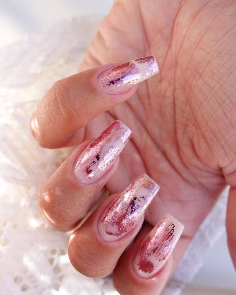 Длинные ногти позволяют создавать самые разнообразные дизайны с использованием фольги. На таких ногтях можно использовать как цельные кусочки фольги, так и различные декоративные элементы, созданные из фольги. Также можно экспериментировать с цветами и оттенками фольги, создавая уникальный и яркий дизайн.
