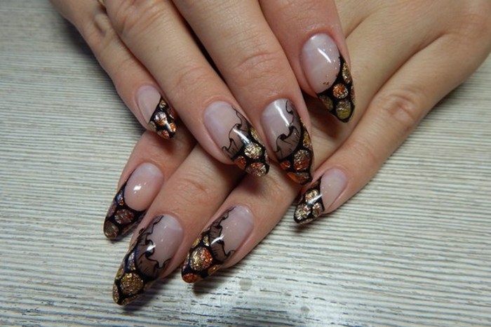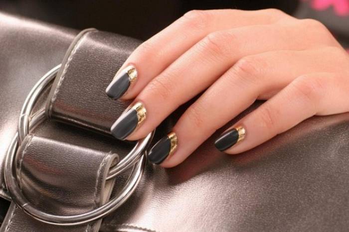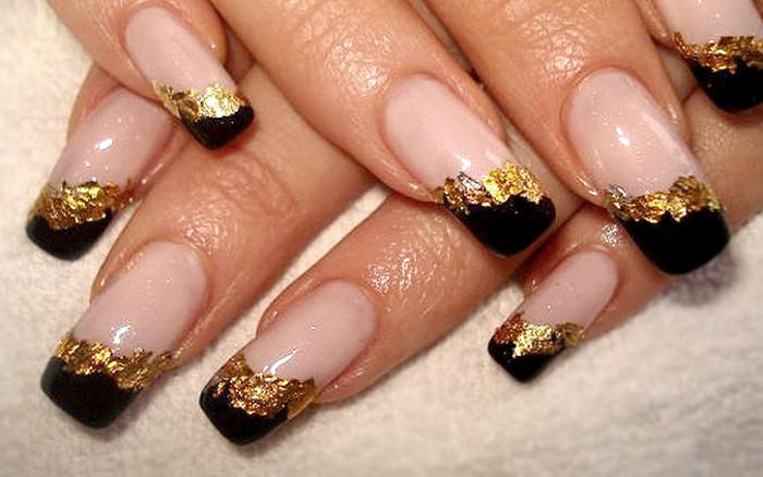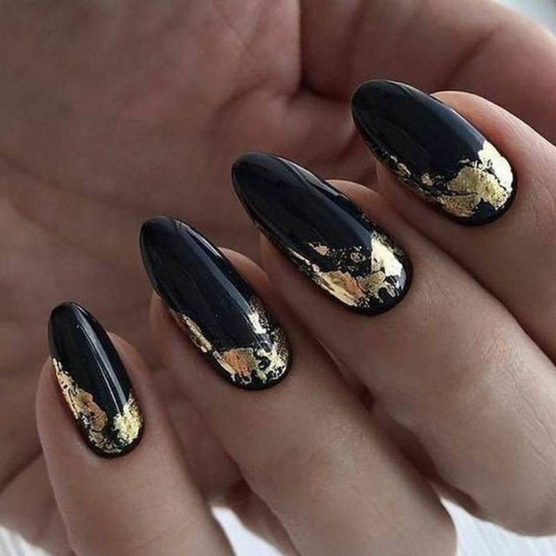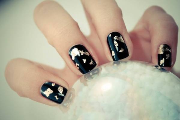 Гармонично смотрится черный лак в сочетании с золотистой фольгрованной бумагой. Подобная комбинация никого не оставляет равнодушным. Ее выбирают женщины, мечтающие об идеальном маникюре.