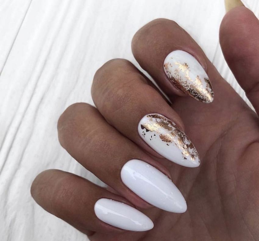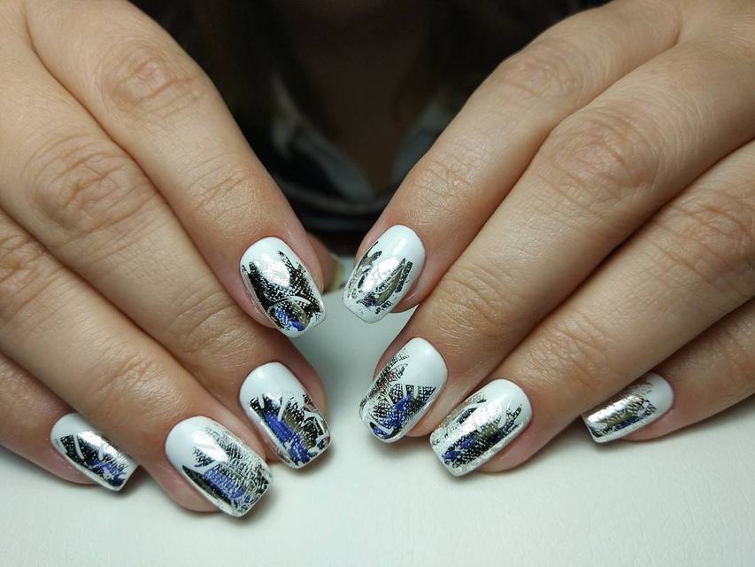 Многим женщинам полюбился лак белого цвета. Его можно комбинировать со всеми разновидностями фольги, даже с цветной.
