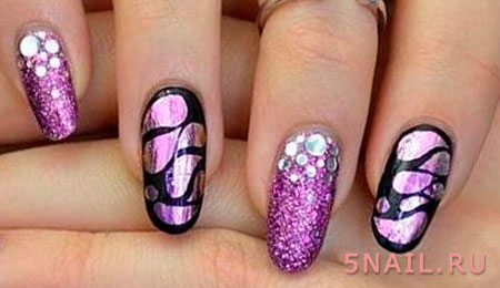 Можно экспериментировать с “драгоценной” фольгой: золотой, серебряной. Потрясающе смотрятся зеркальные элементы на покрытиях чёрного, белого, красного цветов. Допустимо сочетать оформление фольгой с кружевом, глиттером, принтом.