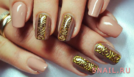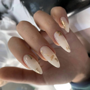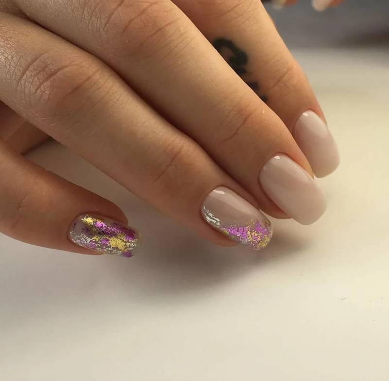 - Легкий нейтральный маникюр с добавлением фольги в виде золотых или серебряных листьев