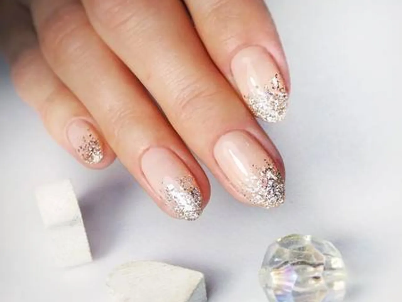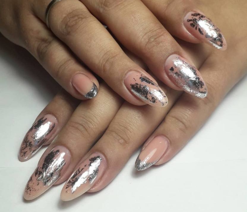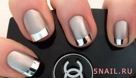 - Французский маникюр с добавлением серебряной или золотой фольги на кончиках ногтей