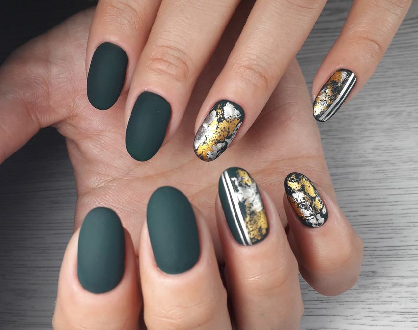 Стремительно покоряет женские сердца зеленый маникюр с фольгой. Он вписывается в различные образы, подходит для офисного, повседневного и торжественного стиля.