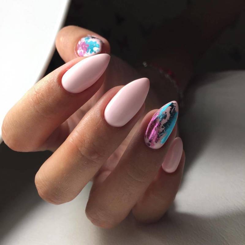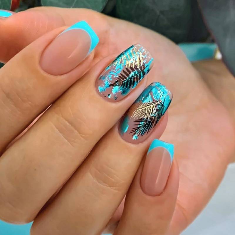 Если душа тяготеет к чему-то необычному, можно сделать голубой нейл-арт. Яркие фольгированные детали преобразят образ. Такая комбинация в моде.