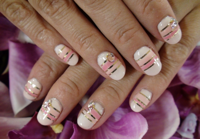- Аккуратно приложите золотую или серебряную полоску липкой стороной на место соединения разных цветов лака.