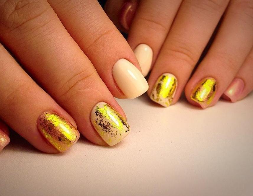 К трендовым вариантам относят желтый нейл-арт. Солнечные тона отлично гармонируют с металлизированной бумагой.