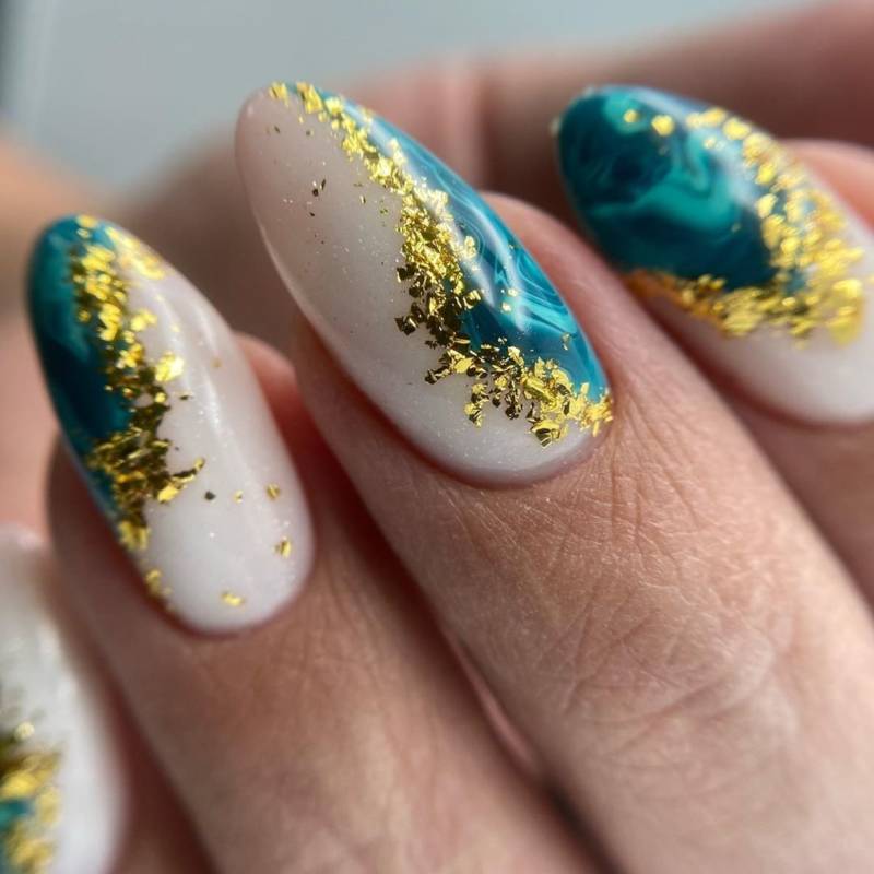 Бирюзовый маникюр с фольгой — это яркий и свежий вариант для летнего периода. Он придает ногтям яркий цвет и подойдет для создания яркого летнего образа.