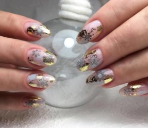 - Маникюр с фольгой в виде снежинок или звезд для новогодних праздников