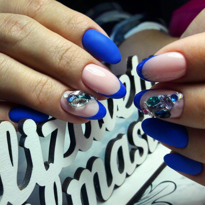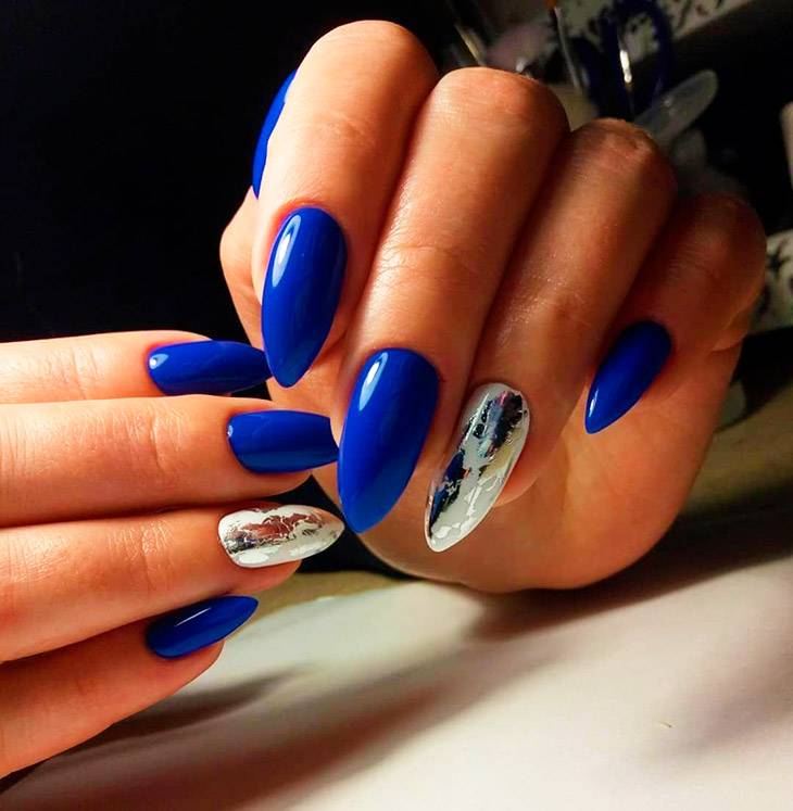 Синий маникюр на миндальных ногтях