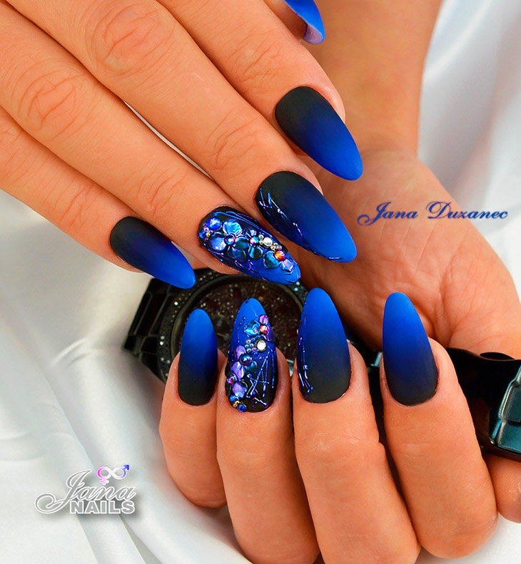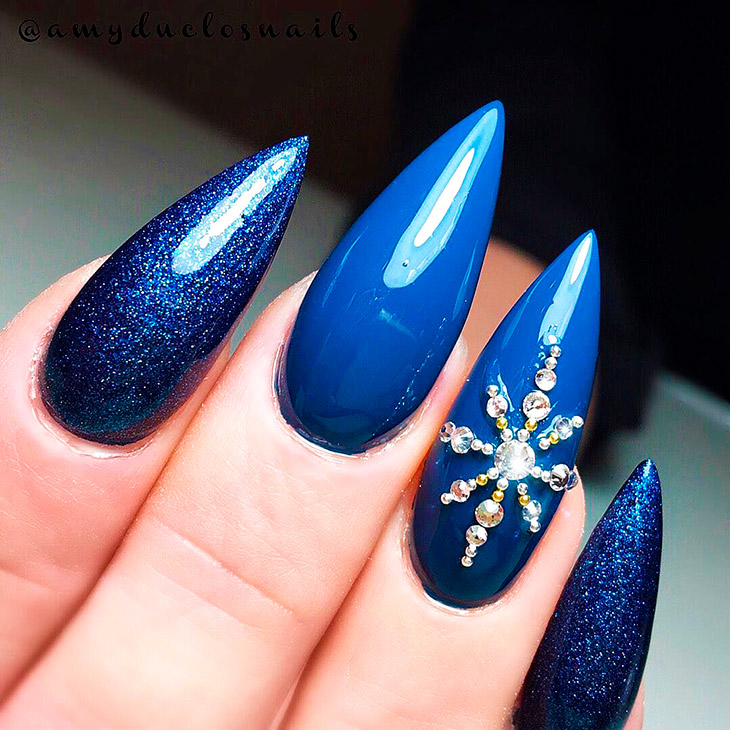 На длинных ногтях особенно красиво смотрится дизайн в синем цвете, где присутствует глиттер или цветные камни. Декор из страз разных размеров любой маникюр делает роскошным. Камни могут украшать только один ноготь, а могут декорировать все пальцы.