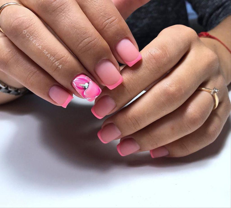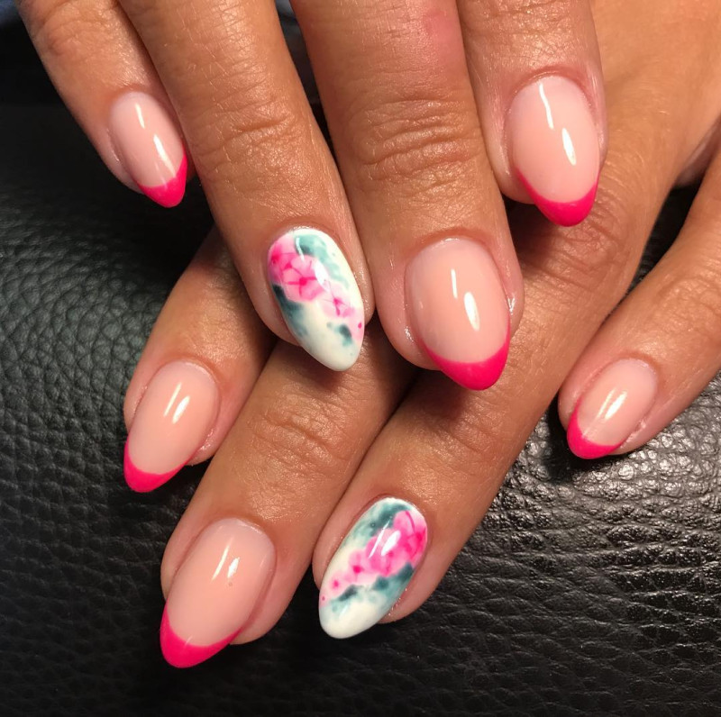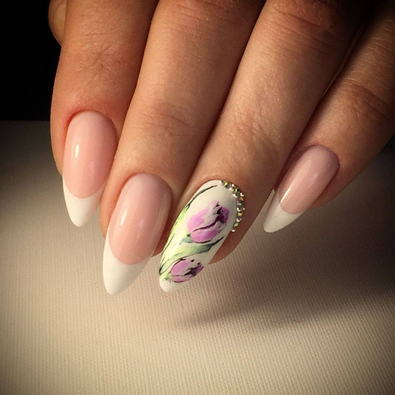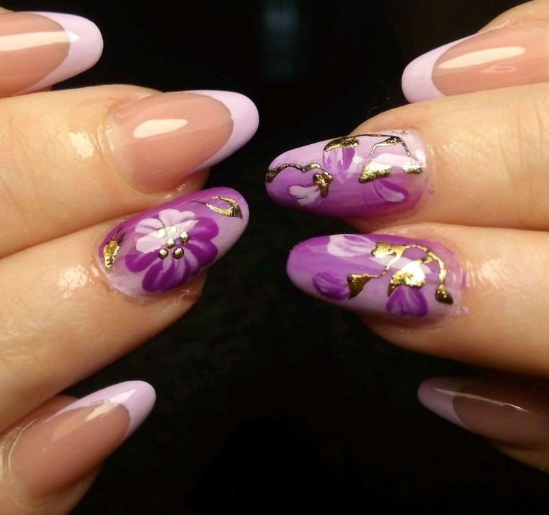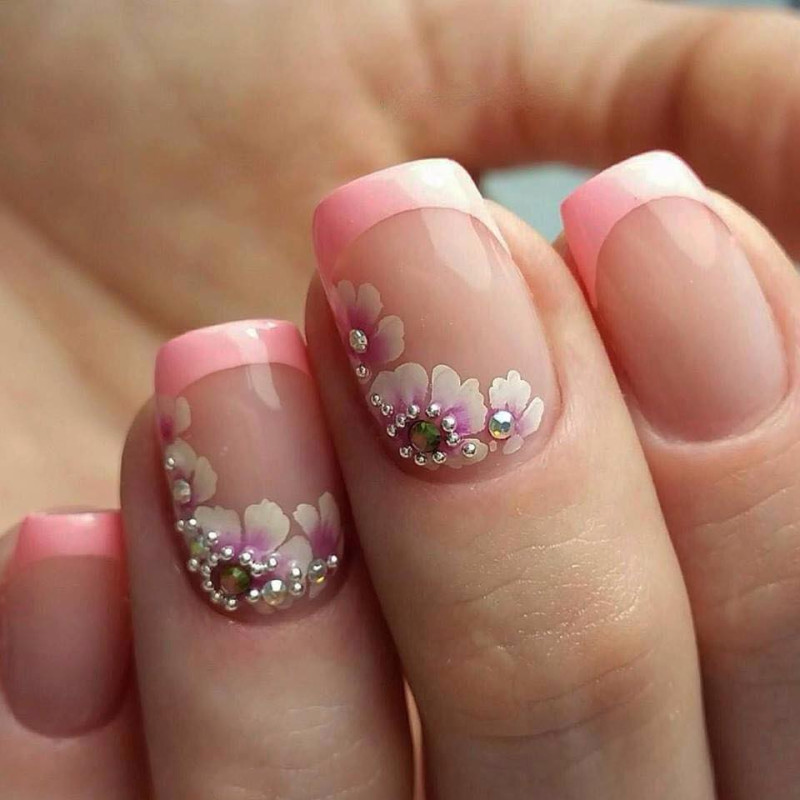 Цветочным рисунком декорируют френч, правильнее, если узор будет начинаться с середины ногтевой пластины. Рисунок привязывают к френчу, так он становится гармоничным естественным продолжением всей композиции нейл-арта.