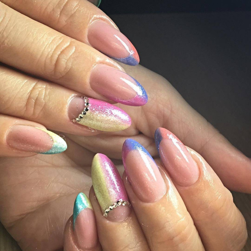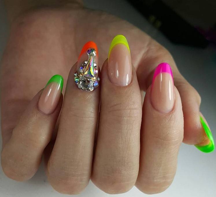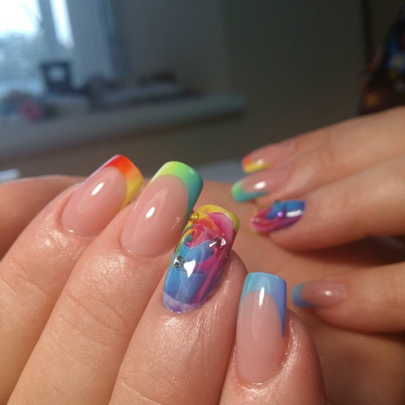 Если хочется выделиться, акриловые ногти лучше украшать в одном стиле. Не стоит оформлять каждый палец отдельно. Это будет смотреться вульгарно! Для ярких девушек подойдет интересное оформление разноцветными стразами с вертикальным градиентом.