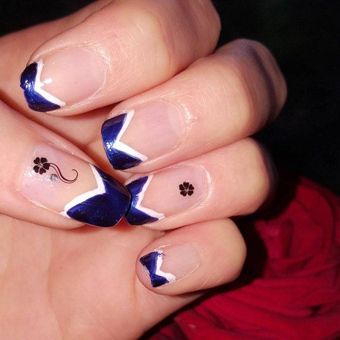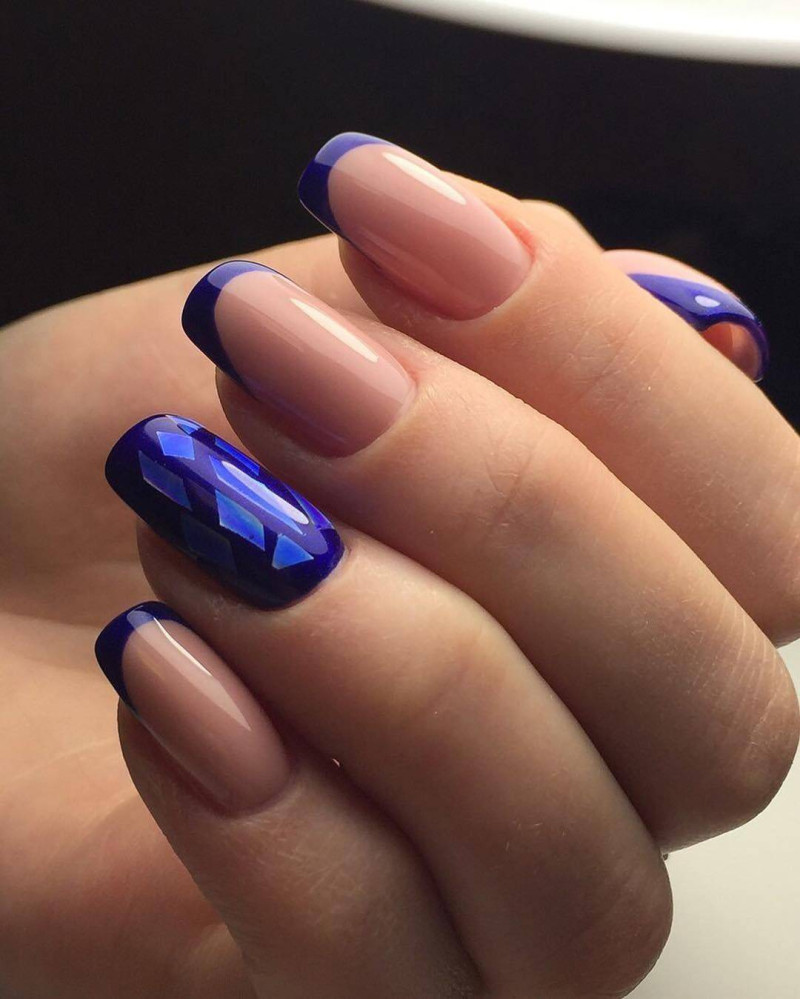 Синий френч может иметь стандартную изогнутую линию улыбки или состоять из нескольких линий, оформляться в форме буквы V, скосов, диагоналей, треугольников или их комбинаций и даже квадратов