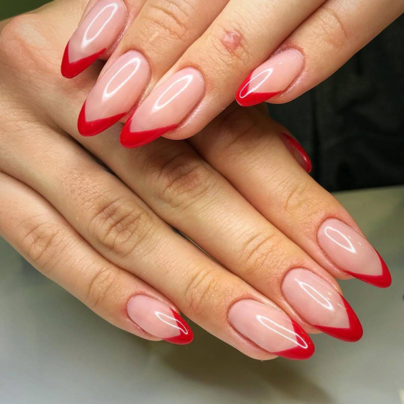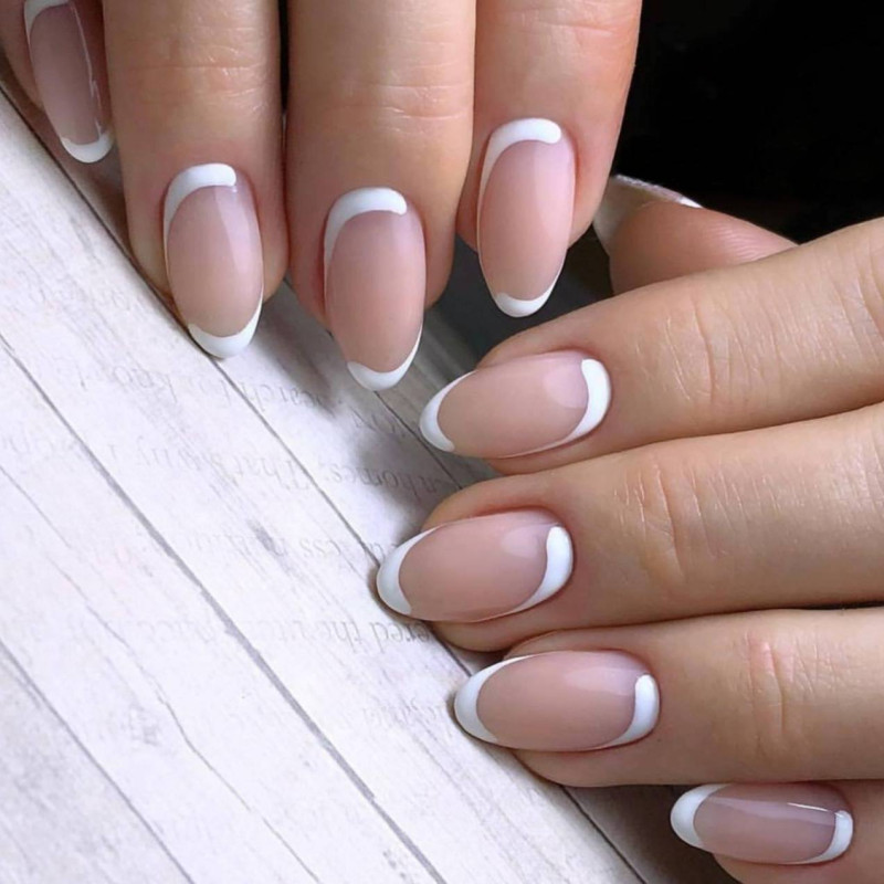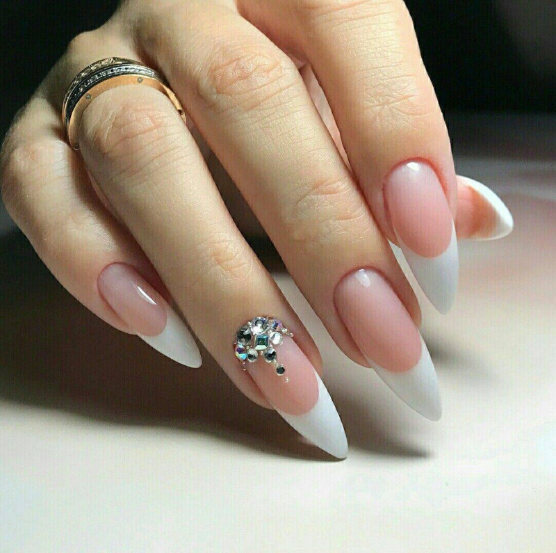 Острые ногти имеют три разновидности – пики, стилет и миндалевидная с острым краем. Именно от формы ногтей будет зависеть форма «улыбки» френча. На острых ногтях лаконично смотрятся только две разновидности френча: треугольная и классическая овальная.
