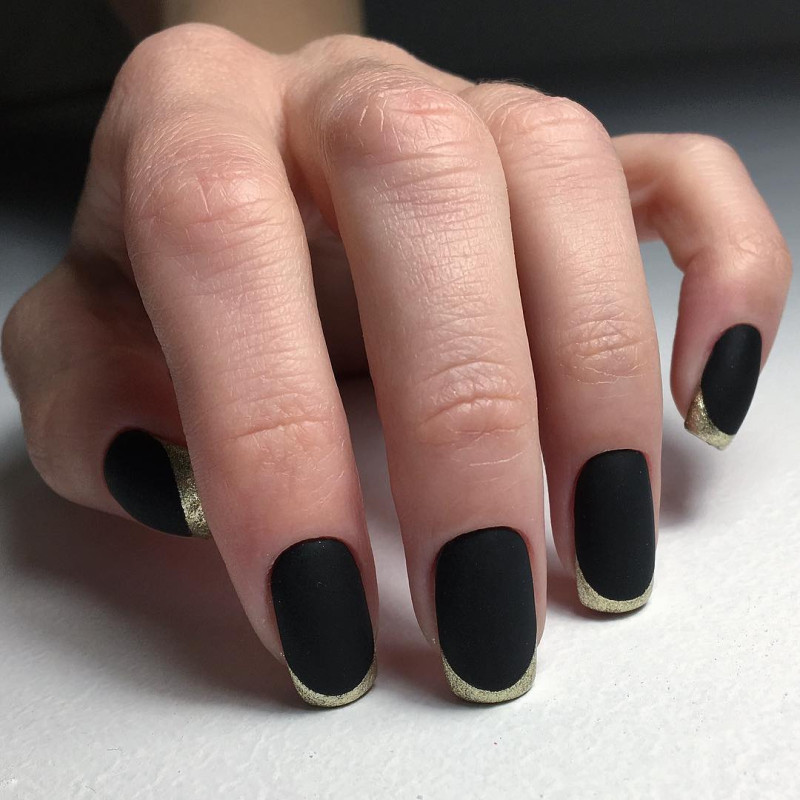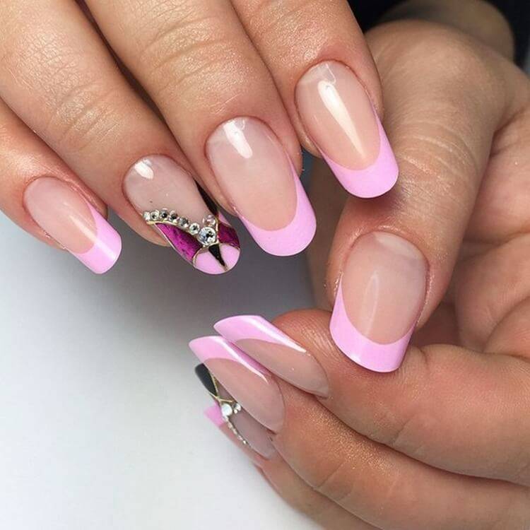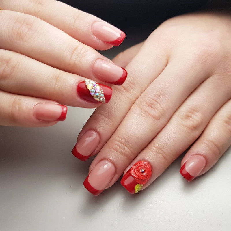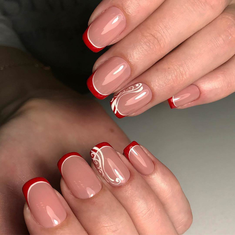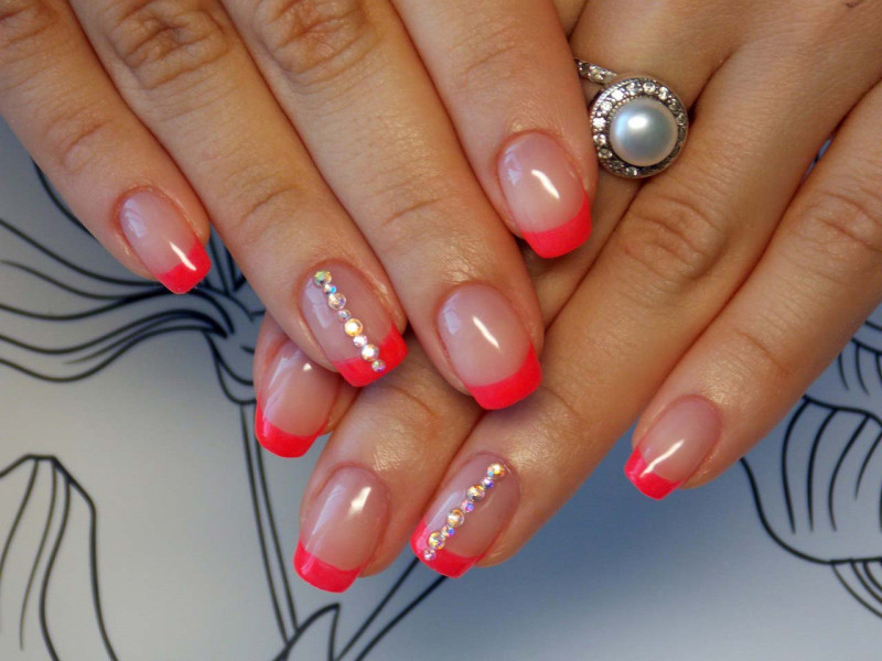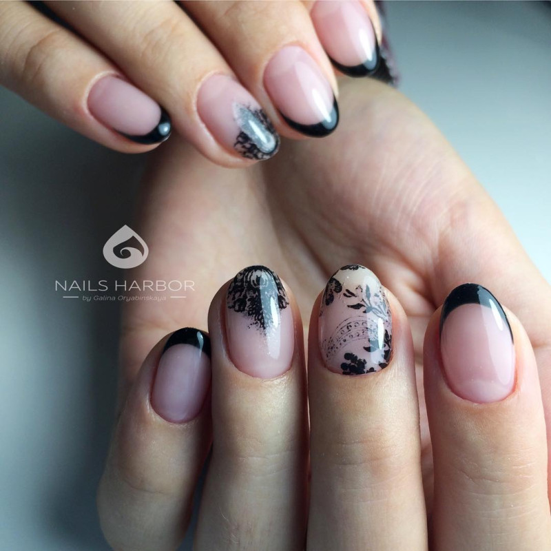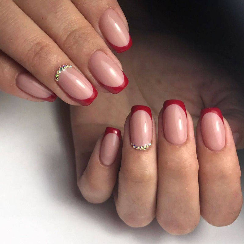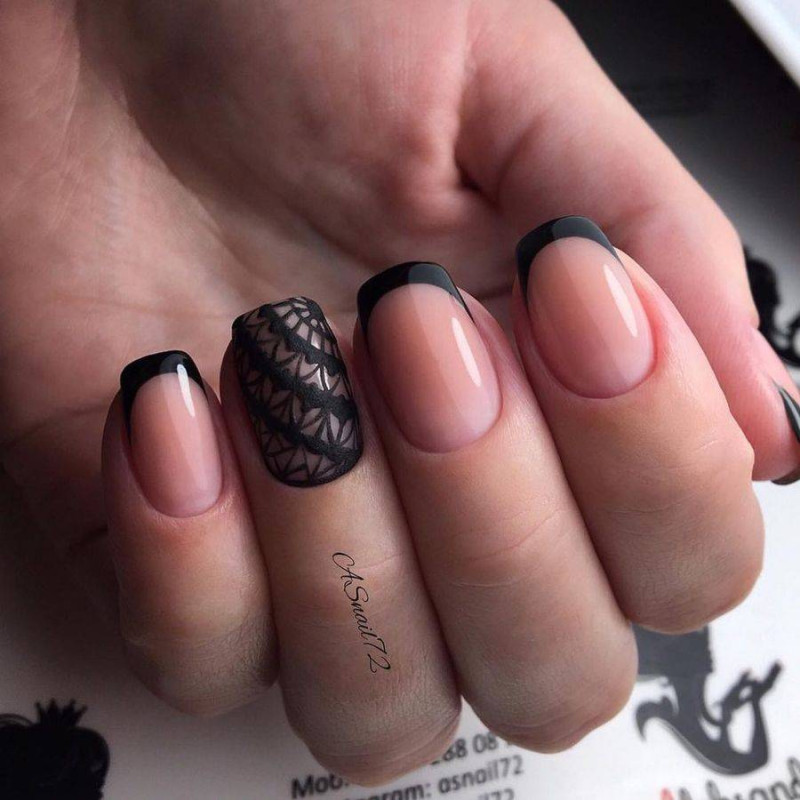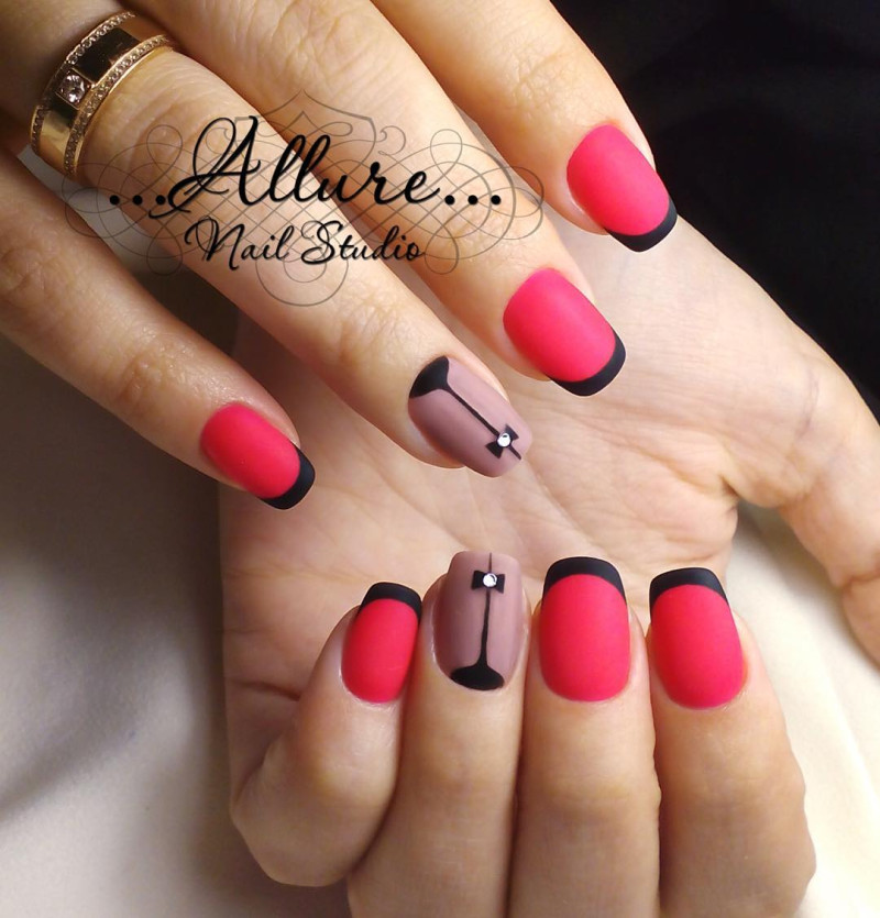 Контрастный лак, наносимый по линии улыбки или лунки, можно заменить мелким горошком, градиентным обмре, сердечками, располагаемыми на кончиках ногтей или всевозможными видами отделки