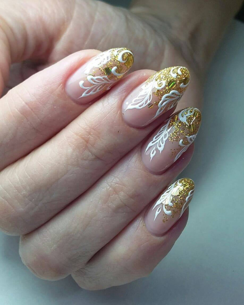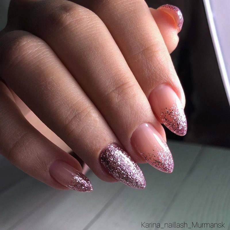 Не стоит декорировать все ноготки. Блестками достаточно выделить 2-3 ногтя для утонченности и изысканности.
