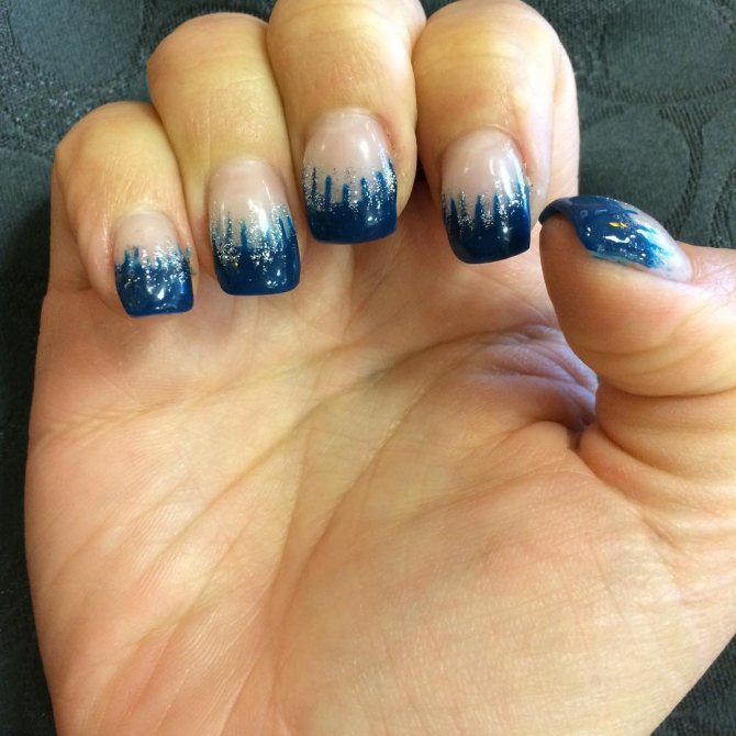 - Необычно и эффектно исполнить новогодний френч с применением серебристого шиммера и страз. По контуру синей улыбки расположить переливающиеся блестки. В качестве основного покрытия ногтевого ложа использовать гель-лак голубого оттенка. На безымянном ногте стразами инструктировать новогоднюю композицию. Это может быть: снежинка, елочная игрушка или же снеговик. Последним шагом будет закрепление дизайна финальным топом.
