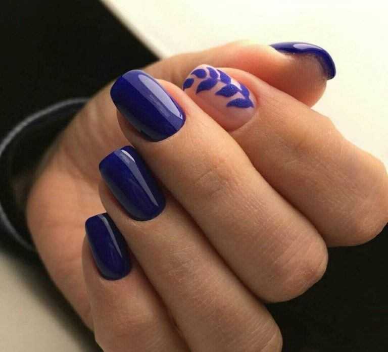 Удивительно, но именно ультрамарин вытаскивает любую форму, длину и декор ногтей. Следует оставить в стороне стразы и блески, выбрав сочетание с другими цветами и рисунками. Хороший вариант дизайна: полностью чёрные ногти с проблеском ультрамарина по центру.